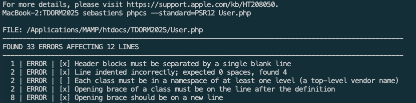 vendor/bin/phpcbf –standard=PSR12 User.php