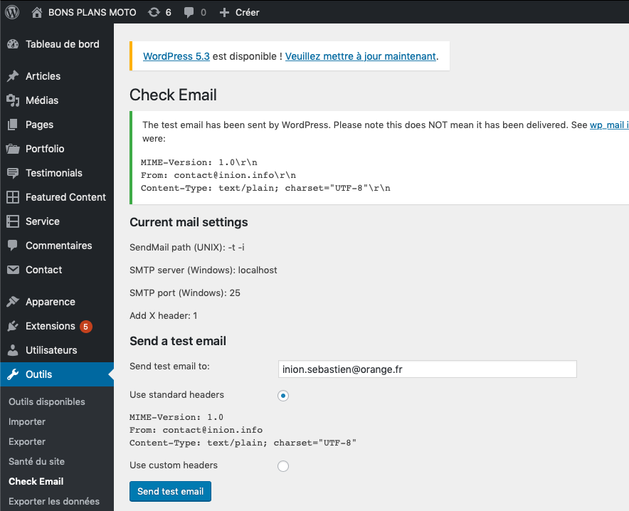 Puis tester l’envoie d’un e-mail à l’adresse de votre choix.
