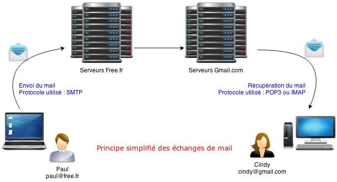 - Cindy lance son logiciel de messagerie. Le logiciel se connecte au serveur gmail.com (car ses mails sont stockés chez gmail). Pour se connecter au serveur gmail, le logiciel utilise soit POP3 soit IMAP (nous verrons à quoi cela correspond)