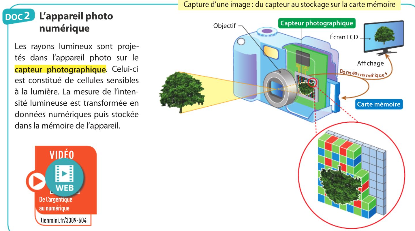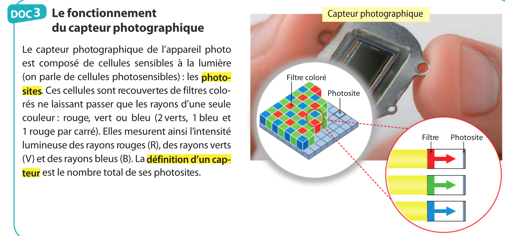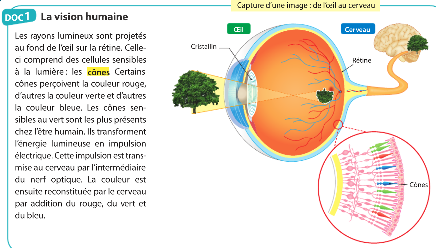 – Le message est envoyé après au cerveau ou au processeur. - DOC 1 & 3 : Comparer la structure de la rétine de l’oeil et celle d’un capteur photo.La rétine est constituée de cônes qui sont des cellules sensibles à la lumière bleue, verte ou rouge. Le capteur grâce au filtres est sensible au mêmes couleurs et dans la même proportion. En effet il y a plus de cônes sensible à la lumière verte dans l’oeil et il y a plus de photosite sensible au vert dans les capteurs.
