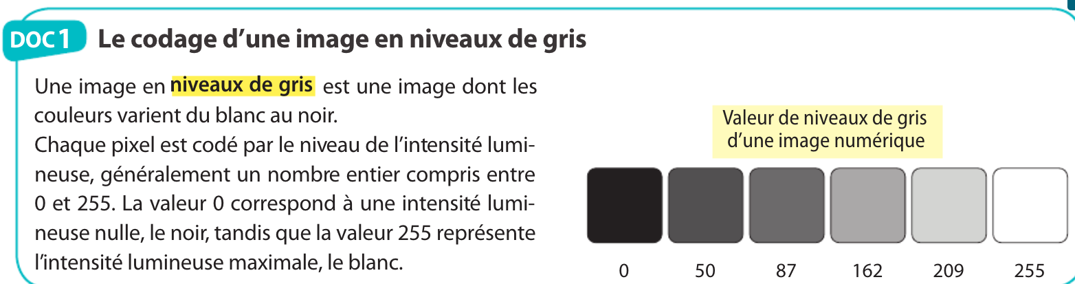 - DOC 1 : Combien y a t-il de niveaux de gris possibles ? Le niveau de gros de valeur 125 est-il plus près du noir ou du blanc ?Il a 256 niveaux de gris possibles de 0 à 255. (0 étant un noir et 255 le blanc pur on peut effectivement les retirer des gris mais en informatique on ne fait pas cette