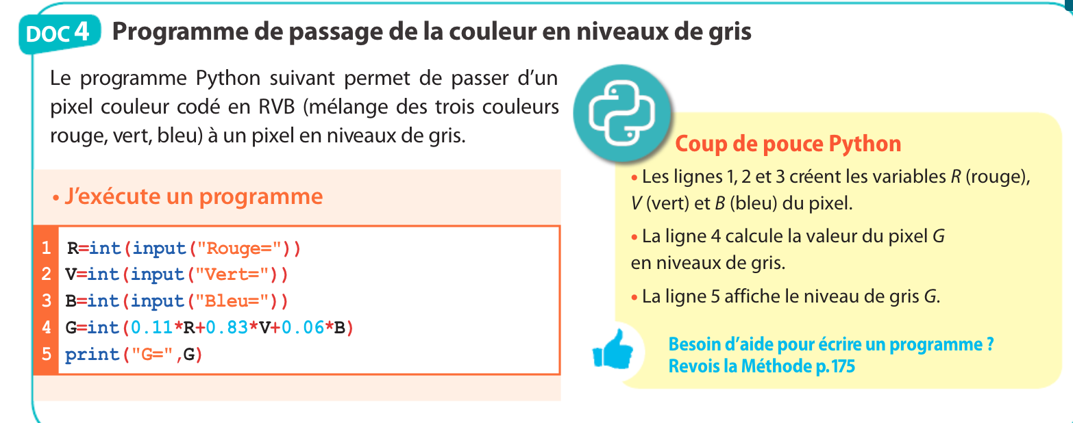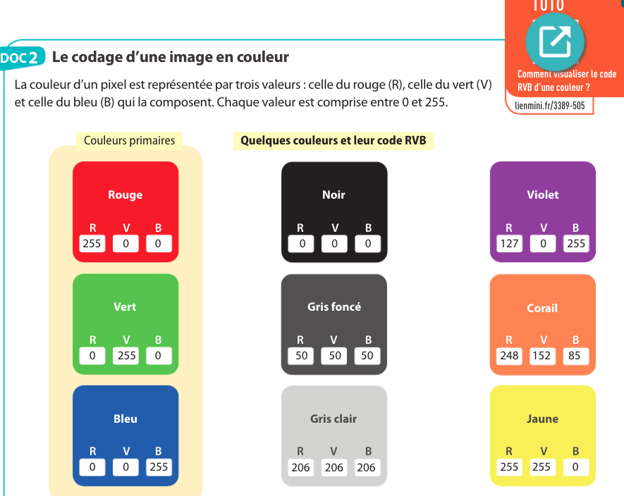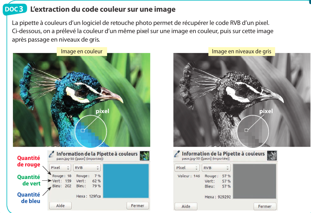 Pourquoi 256 valeurs car chaque couleur est codé sur un octet. Or un octet c’est 8 bits. Et 2 à la puissance 8 donne 256. On a donc 256 combinaisons possibles. - DOC 2 : Que remarque-t-on pour les valeurs R,V,B d’une couleur grise . Quelles sont les valeurs RVB du blanc ?Quand R = V= B alors on a du gris. Bien sur suivant cette valeur unique le gris est plus ou moins clair.