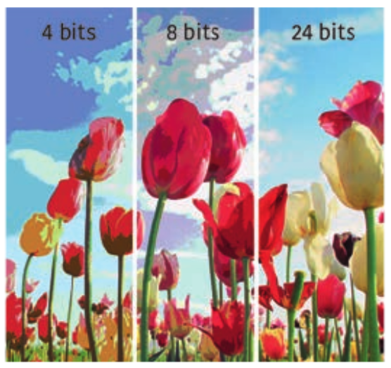 - La profondeur de couleurOn appelle profondeur des couleurs le nombre de bits utilisés pour coder la couleur d’un pixel d’une image. Elle s’exprime en bit par pixel. Un codage sur n bits correcponds à 2 puissance n couleurs. Donc pour 1 bit vous aurez 2 couleurs possibles ( 2 puissance 1 = 2 ). Pour 2 bits vous aurez 2X2 = 4. 4 couleurs possibles. Souvent nos photos sont codés sur 16 bits. On a donc 65 536 couleurs ( ou teintes possibles ).