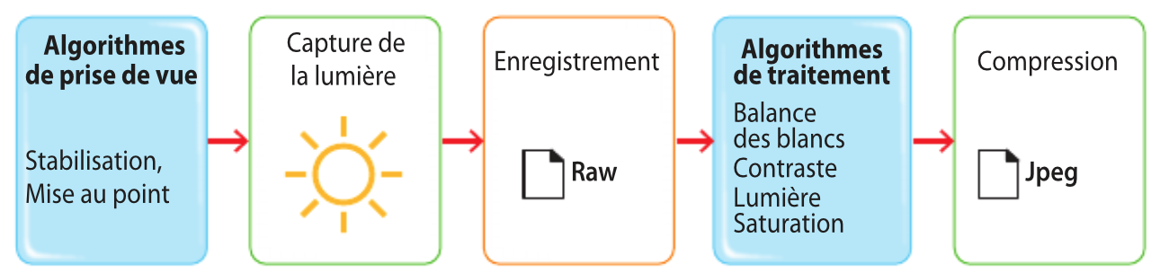 - Le rôle de l’algorithme dans la photoLes appareils photos actuels ne font pas que capturer la lumière. Il aide l’utilisateur dans les réglages. En effet ces appareils possèdent un processeur et un système d’exploitation ainsi que des programmes qui permettent d’obtenir de l’aide dans la prise de vues. Il y a donc de nombreux algorithmes qui interviennent au cours de la capture et du traitement de l’image.