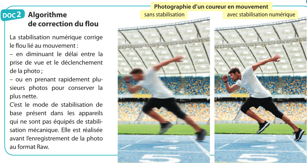 Le stabilisateur numérique modifie la manières dont la photo est prise sans faire bouger le capteur : soit en prenant plus rapidement la photo. Soit en prenant plusieurs et en les superposants. - DOC 3 : Que permet le focus peaking ? Le focus peaking permet de repérer où on fait la mise au point, quels sont les éléments les plus nets sur la photo.