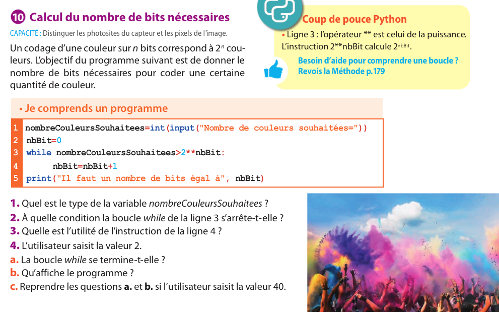 - La boucle s’arrête dès que la valeur de la variable nombreCouleurSouhaitees est plus petite ou égale à 2**nbBit ( ** signifie puissance en Python)