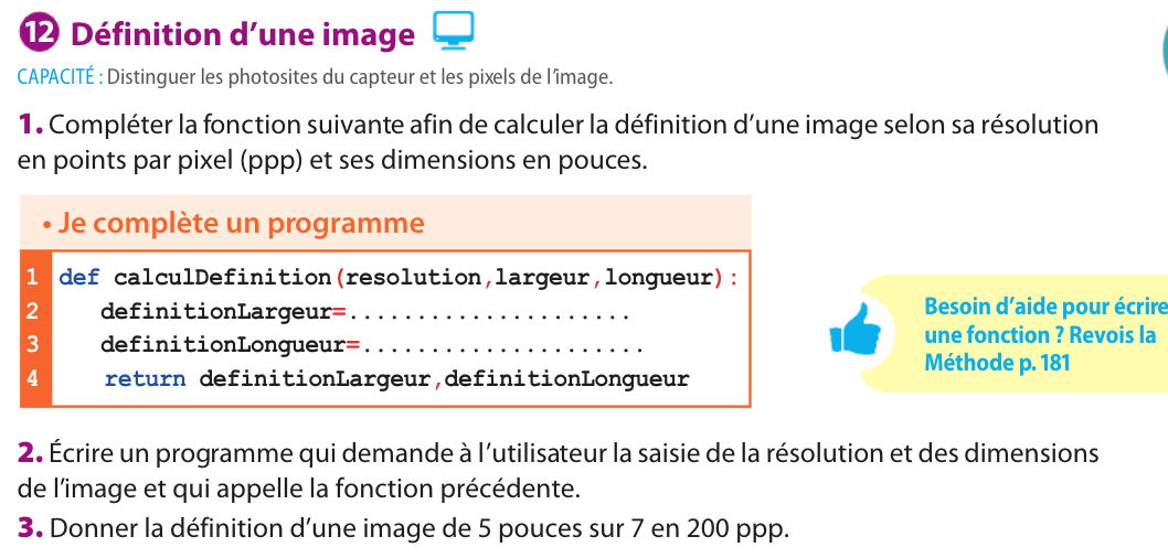 [pastacode lang= »python » manual= »def%20calculDefinition(resolution%2C%20largeur%2C%20longueur)%3A%0A%20%20definitionLargeur%20%3D%20resolution%20*%20largeur%20%0A%20%20definitionLongueur%20%3D%20resolution%20*%20longueur%20%0A%20%20return%20definitionLargeur%20*%20definitionLongueur%0A%0Aprint%20(calculDefinition(300%2C%206%2C%205)) » message= » » highlight= » » provider= »manual »/]