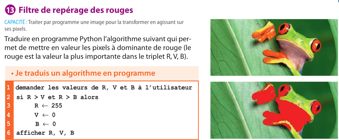 [pastacode lang= »python » manual= »R%20%3D%20int(input(%22Rouge%20%3D%22))%0AV%20%3D%20int(input(%22Vert%20%3D%22))%0AB%20%3D%20int(input(%22Bleu%20%3D%22))%0Aif%20R%3EV%20and%20R%3EB%3A%0A%20%20R%20%3D%20255%0A%20%20V%20%3D%200%0A%20%20B%20%3D%200%0Aprint%20(R%2CV%2CB) » message= » » highlight= » » provider= »manual »/]