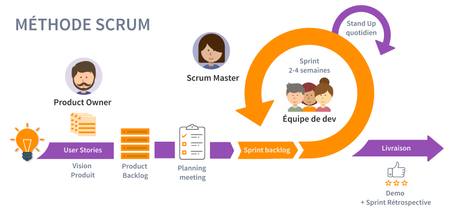 La vie d’un projet Scrum est rythmée par une série d’événements contenus dans des « boîtes de temps » (time-boxes) pour garantir une régularité et une efficacité maximales.